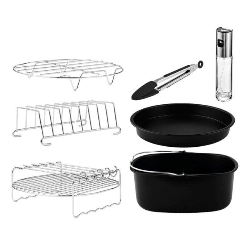 | Accessori inclusi | Stampo pizza 20 x 2,5 cm, stampo dolci 20 x 7,2 cm, pinze silicone 21 cm, griglia grill 20 x 14,7 cm, spiedini, supporto metallo 19,5 x 2,5 cm, supporto toast 14,7 x 10,5 cm, spruzzatore olio 100 ml |