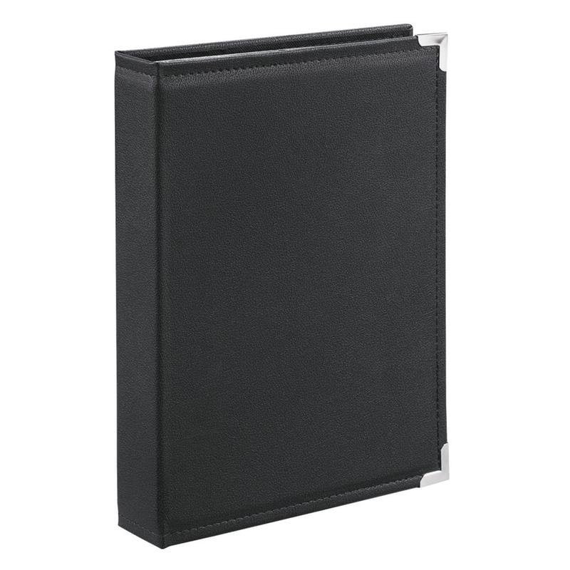 Eleganza e robustezza. La copertina in similpelle nera con cuciture decorative regala un tocco sofisticato, ideale per chi desidera unire funzionalita e stile nella propria collezione fotografica. Gli angoli rinforzati in metallo argentato aumentano la resistenza all'usura, garantendo longevita anche all'uso frequente in studio oppure a casa.