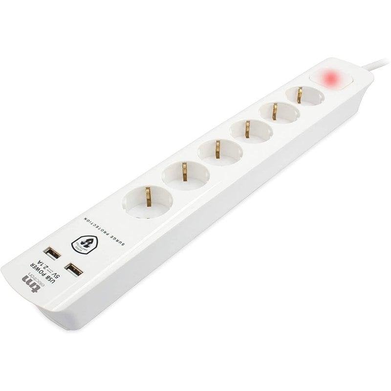 Proteggi e alimenta tutti i tuoi dispositivi con la multipresa TM Electron: 6 prese Schuko e 2 USB in un design compatto, sicuro e pronto all'uso in qualsiasi ambiente domestico o ufficio.