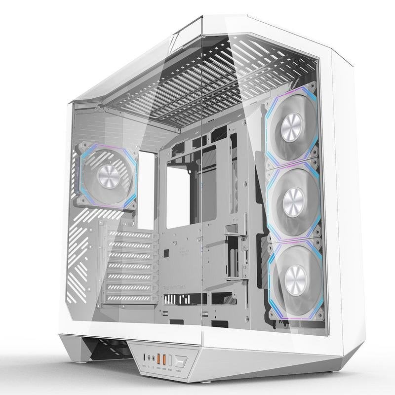 Con tre pannelli in vetro temperato, questo case offre una visione panoramica a 330°, ideale per chi desidera mostrare la propria configurazione hardware e l'illuminazione ARGB multizona integrata. Il supporto fino a 10 ventole da 120 mm e compatibilità con sistemi a liquido – sia radiatori da 360 mm che 240 mm – garantiscono raffreddamento avanzato anche in overclock estremo. La struttura consente l'installazione di GPU fino a 410 mm (o 390 mm verticalmente), dissipatori CPU alti fino a 175 mm e alimentatori ATX/EPS da 200 mm, assicurando spazio e versatilità per i componenti high-end più attuali.