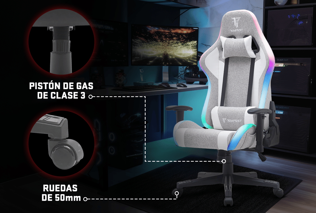 - Costruzione di qualità. La sedia Tempest Glare RGB è costruita con materiali di alta qualità, tra cui similpelle e tessuto ultra resistente, che ne garantiscono la durata nel tempo. Il pistone a gas di classe 3 da 80 mm, la base in nylon da 350 mm e le ruote da 50 mm garantiscono una mobilità fluida e una solida base di supporto.