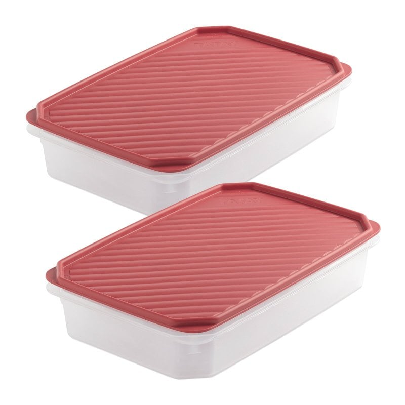 Confezione da 2 contenitori rettangolari piatti TATAY Top Flex da 2,1 l, realizzati in polipropilene con coperchio ermetico a pressione, molto resistente e facile da pulire. Il coperchio è flessibile e progettato in modo che i contenitori possano essere impilati tra loro.