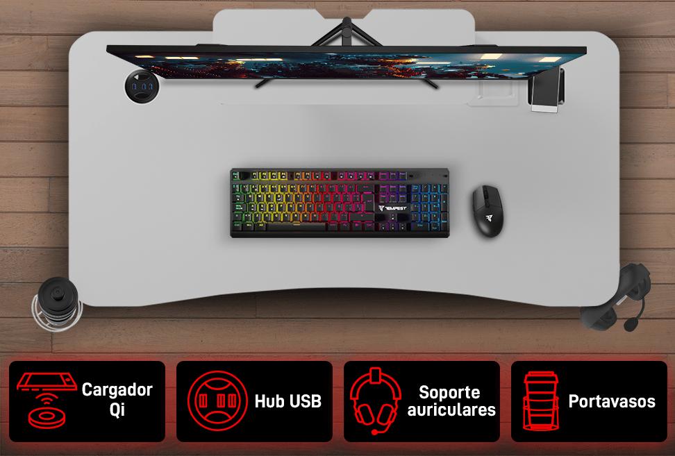 Portabicchieri antigoccia, supporto per cuffie, caricabatterie Qi e hub USB. Ottimizza il tuo spazio di gioco con accessori che garantiscono la massima efficienza