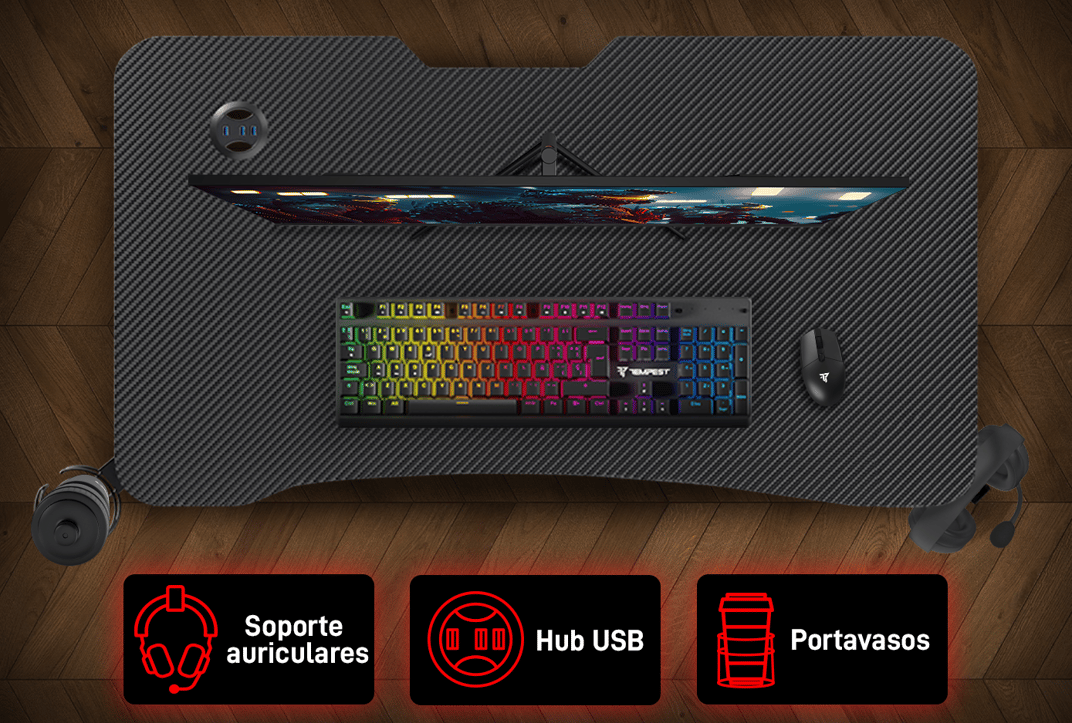 - Accessori inclusi: portabicchieri, porta cuffie, hub USB e organizer per cavi per la massima organizzazione durante le tue partite.